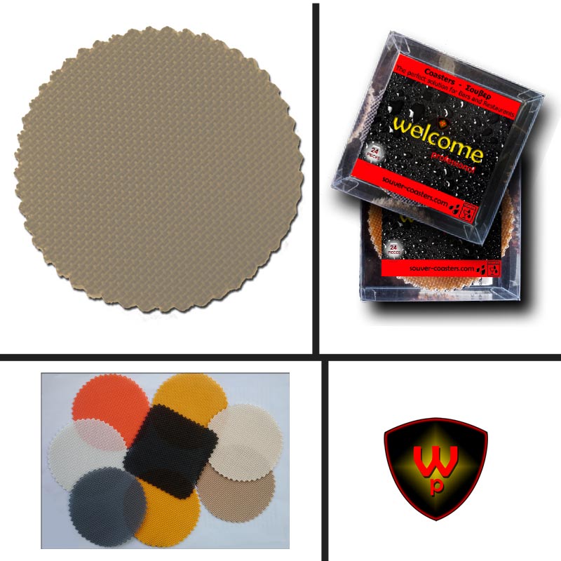 Souver coasters. The package contains 24 pieces. Thin with high durability, they apply to any surface and for many uses. Waterproof. 9.3cm size